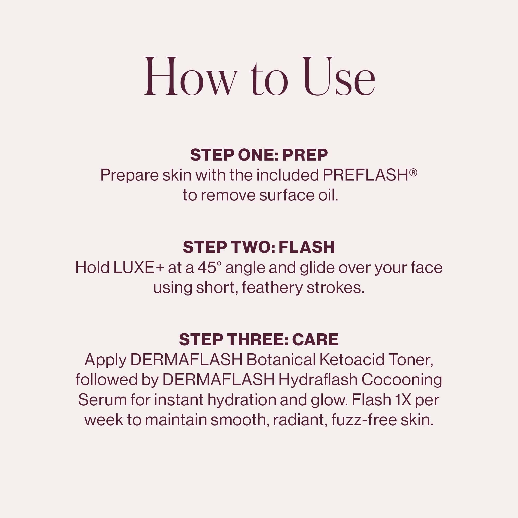 Prepare skin with PREFLASH to remove surface oil and temporarily make skin tighter, for effortless removal of peach fuzz + dead skin.
