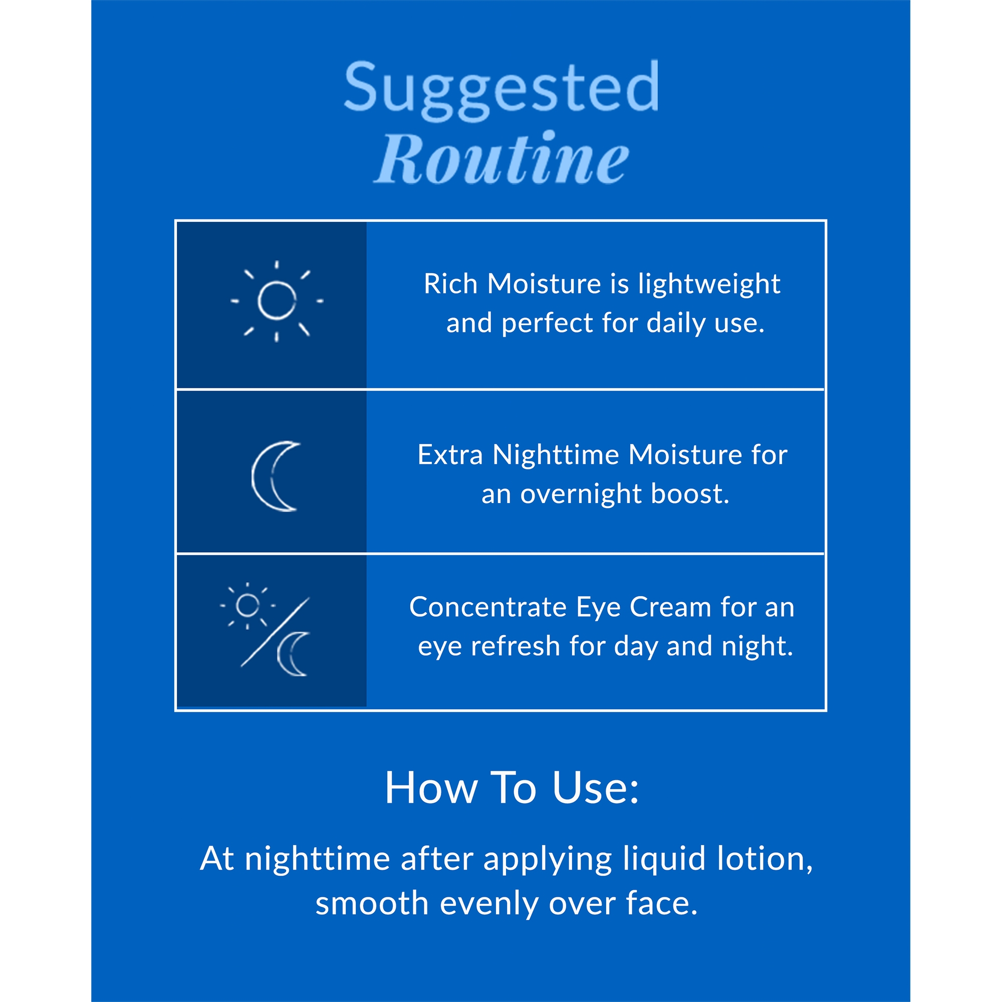 At night after cleansing and toning skin, smooth a small amount evenly over your entire face.